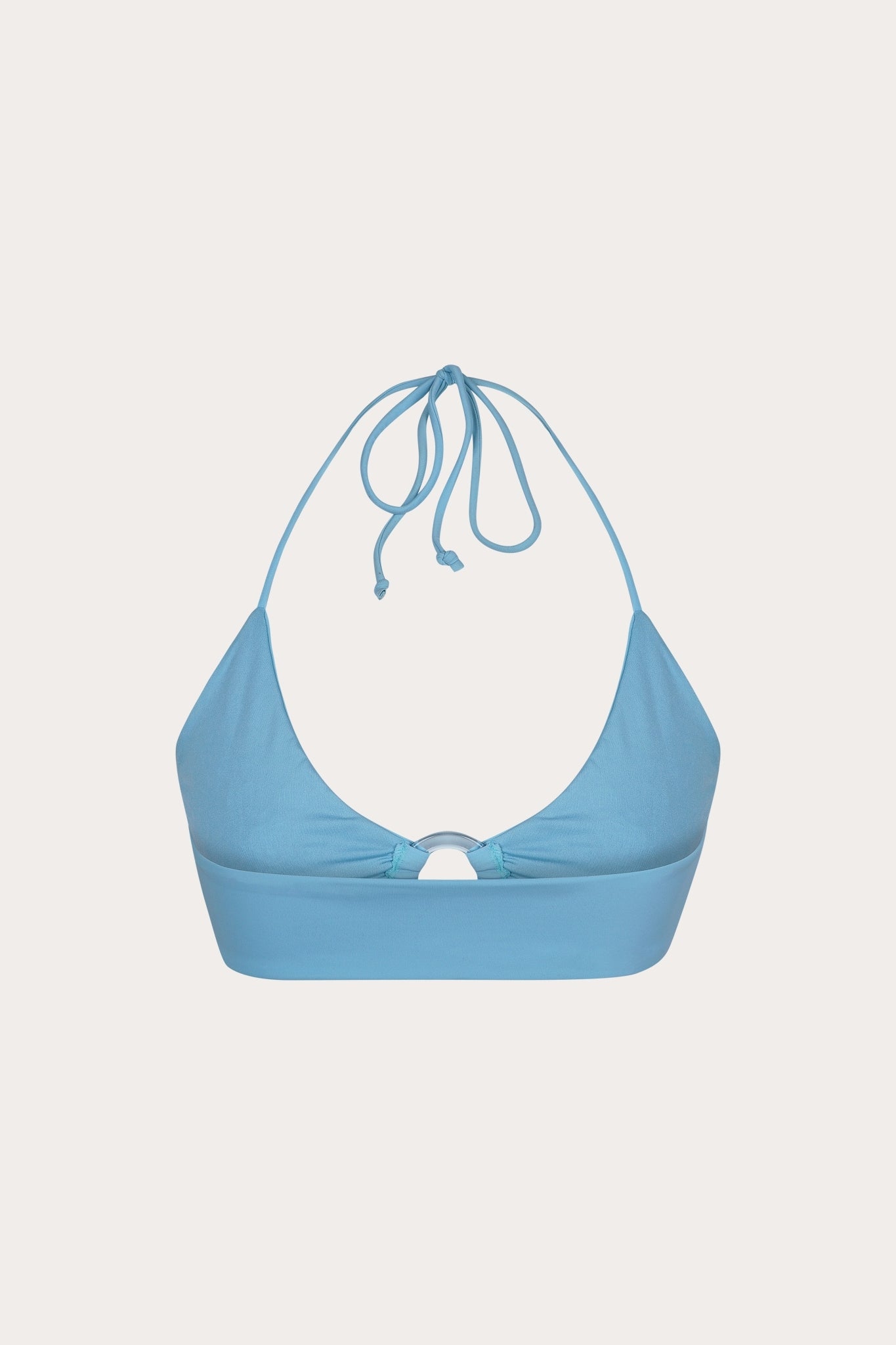 A classic bralette bikini top with a clear ring in the middle, finished with hand-beaded starfish details with all around beading.